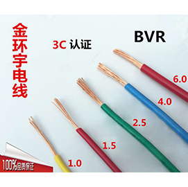 金环宇BVR 2.5电线铜芯聚氯乙烯绝缘软电线,电缆生产厂家金环宇以上型号bvr电线还可以生产阻燃性(ZR)/耐火型(NH)l两种特性。适用于交流电压450/750V及以下动力装置、日用电器、仪表及电信设备用的电缆电线。
